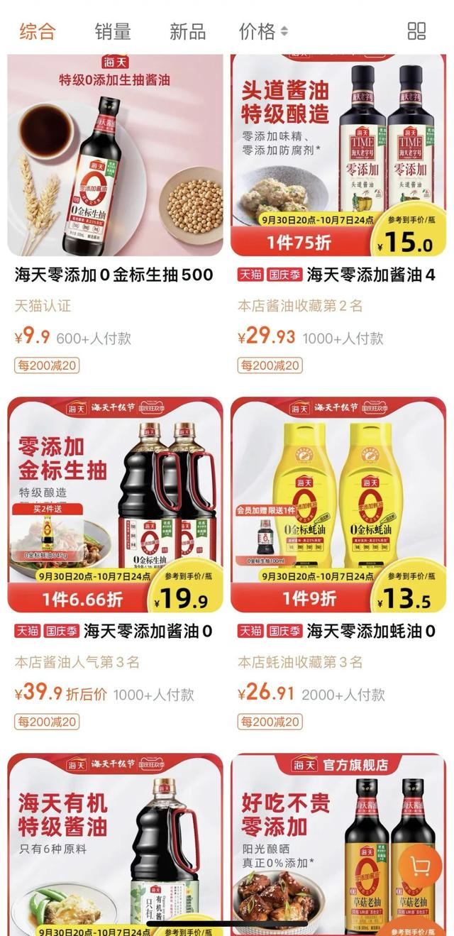 具体差异体现在,如海天官方天猫旗舰店中,一瓶“0金标生抽”的售价为9.9元,而经典“金标生抽”的套餐价(2瓶)为20.9元,相当于一瓶10.45元,有添加剂的酱油价格更贵。