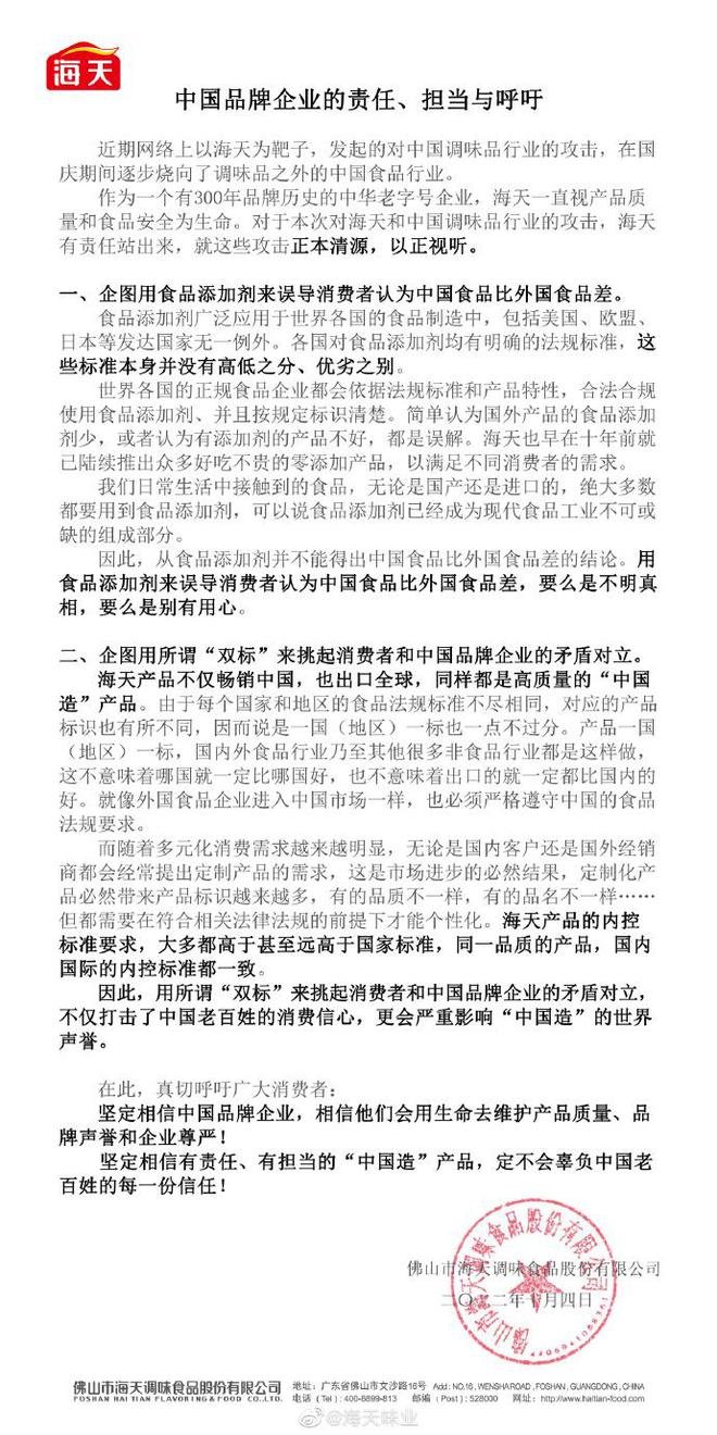 国庆期间,市值3800亿元的“酱油茅”海天味业忙着网络辟谣,没得歇。食品添加剂“双标”风波还在持续发酵,10月4日晚间,海天味业再次发布声明称,海天产品的内控标准要求,大多都高于甚至远高于国家标准,同一品质的产品,国内国际的内控标准都一致。