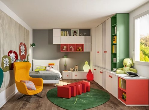 出于长远空间价值考虑,我们应该提前规划好充足的收纳空间,随着孩子年龄增长所需要存放的生活物品也会随之增多,我们最好将卧床和书桌四周设计成隐匿式储物空间,让我们的儿童房时刻保持整洁有序。