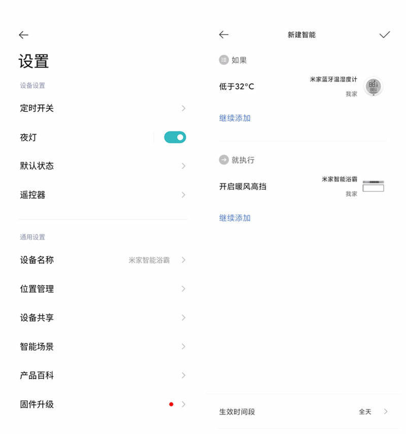 通过与其他米家设备配合,可以实现智能场景设置,比如在浴室中设置米家蓝牙温湿度计,当温度低于32度,自动开启智能浴霸,这是简单的一个例子,大家可以发挥想想,可实现更多的智能化场景。