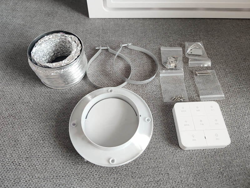 配件上包括铝箔通风管、抱箍、自攻螺丝,集成吊顶卡扣、非集成吊顶卡扣、止逆阀等,无需二次购买。