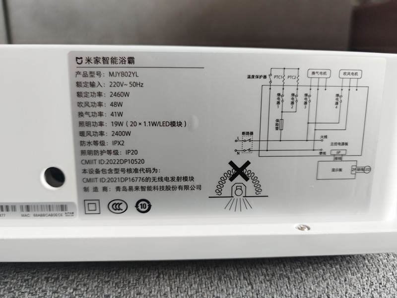 侧面有产品的参数说明,额定功率在2460W,可以看到除了暖风和照明以外,还有吹风除雾和换气功能。