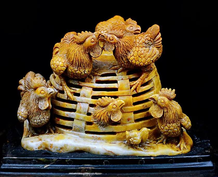 据记者了解,寿山石雕收藏家黄坚主要收藏从台湾、新加坡和香港等地回流的老工旧工寿山石雕作品。早期通过新闻采访接触到福州的寿山石,并慢慢接触到很多老一辈的寿山石雕刻大师,并由此渐渐喜欢寿山石,并进入寿山石雕收藏事业。