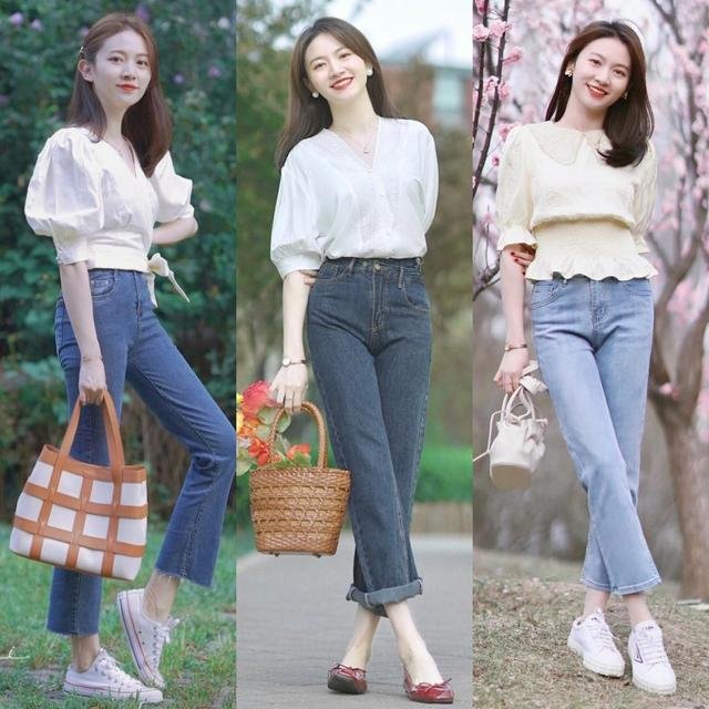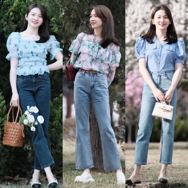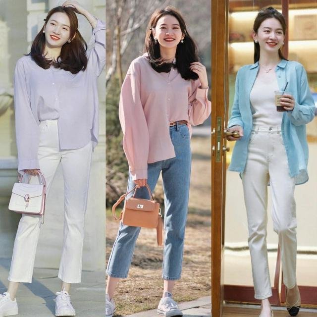 九条牛仔裤加一件衬衫同样是经典的通勤装。为了减少造型的死板,我们放弃了白色衬衫,选择了颜色柔和的莫兰迪衬衫,比如淡淡的高贵的莫兰迪紫或者甜美浪漫的莫兰迪粉,让整体看起来是那么的温柔可爱,而下装牛仔裤让造型充满了朝气和活力。当然,我们不需要把衣服的所有角落都塞进去。就像这位博主,塞一半留一半,很独特,舒适自由,很有时尚个性。