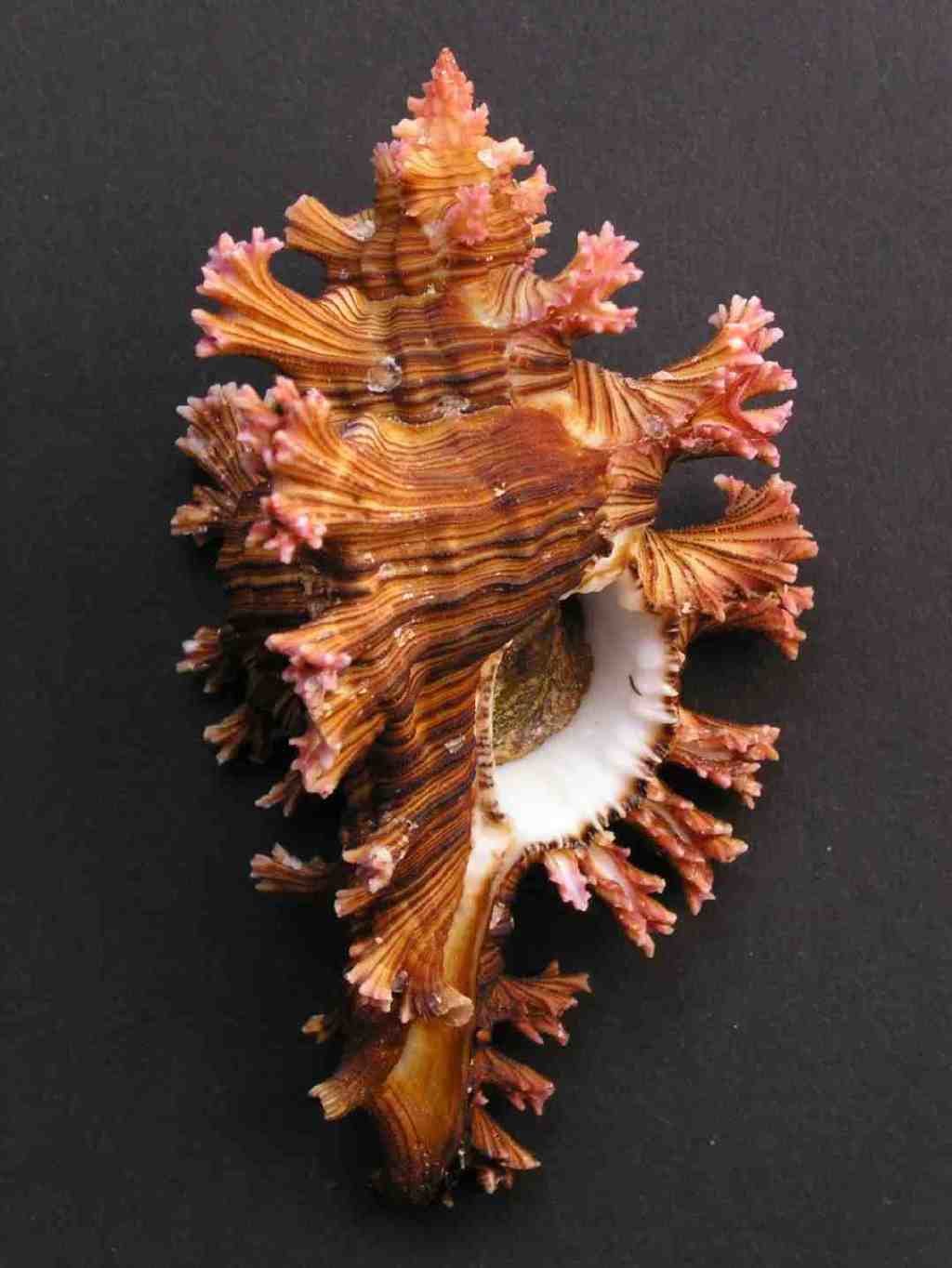 壳呈纺锤形,缝合线深,螺塔高。壳表褐色或浅褐色,有深褐色细螺肋及三条纵胀肋,纵胀肋上长满深紫红色、桃红色或粉红色的短棘,棘末端绽开如花,纵胀肋间有粗瘤突起。