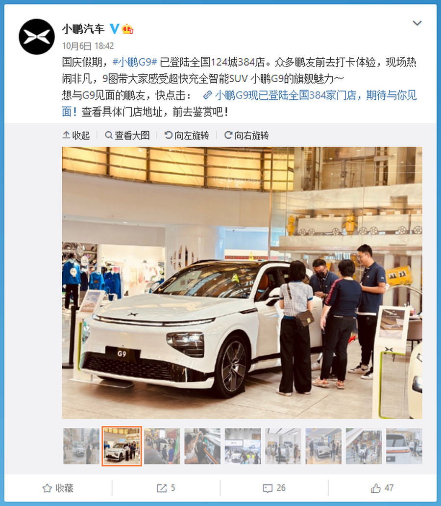 来自小鹏汽车官方微博的消息。小鹏G9已现已登陆全国124城384店,感兴趣的朋友们可以到自家附近的小鹏体验店近距离体验这款全新的旗舰级SUV。