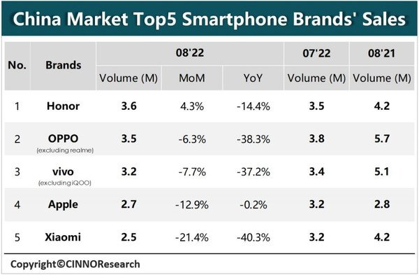 日前,赛诺公布了国内前五大智能手机厂商的销售数据,荣耀单月售出360万部,排名国内市场第一。接下来是OPPO,8月份售出350万部手机,排名国内市场第二。vivo在8月份售出320万部手机,国内排名第三。苹果位居第四,小米排名第五。而与去年8月份的销售数据相比,跌幅最大的是小米,同比下跌40.3%。OPPO虽然出货量还能排名国内第二,但跌幅高达38.3%。苹果的跌幅最小,同比下跌0.2%。这也说明,华为手机受压制,苹果是最大赢家。