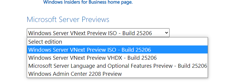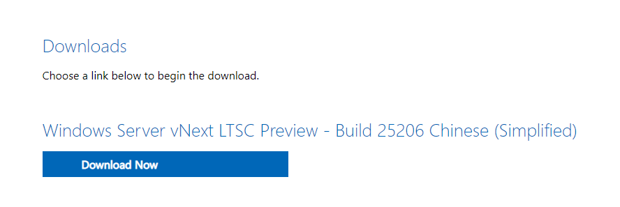 注册的预览体验成员可以直接导航到 Windows Server Insider Preview 下载页面。如果您尚未注册为 Insider,请参阅 Windows Insiders for Business 门户上的服务器入门。