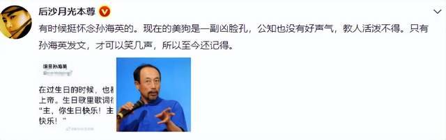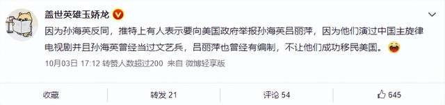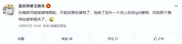 至于孙海英社交账号为何会被锁定,大V“盖世英雄玉娇龙”在微博上爆料称,孙海英并没有遭到禁言,而是有可能被限制了,也就是不能发原创内容。