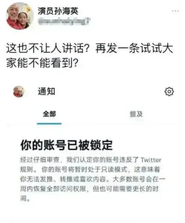 对此,孙海英感到极其的不满,特意晒出了通知内容截图 ,想要证实一下自己是不是真被禁言了,但事实他还是可以发布内容的,只不过很可能是遭到了限制,也就是不能够像之前那样想说什么就说什么。