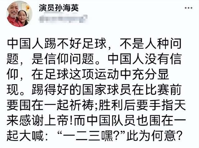 比如在谈到中国人踢不好足球的原因,他认为不是人种问题而是信仰问题,就是因为没有像其它踢得好的外国球员那样,在比赛前围着一起祈祷,要感谢上帝的帮助,而不是“一二三嘿”。