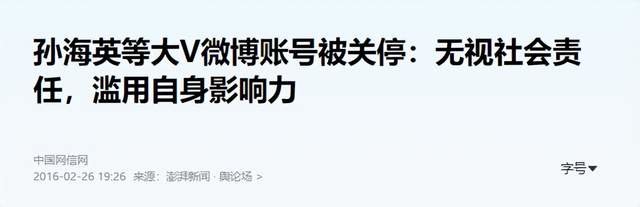 不过话说回来,孙海英的社交账号被锁定,其实也是在预料之中的事,因为他的微博账号在6年前就已经被关停了,理由是“无视社会责任,滥用自身影响力”,讲白了就是口无遮拦,在网上宣传不好的思想。
