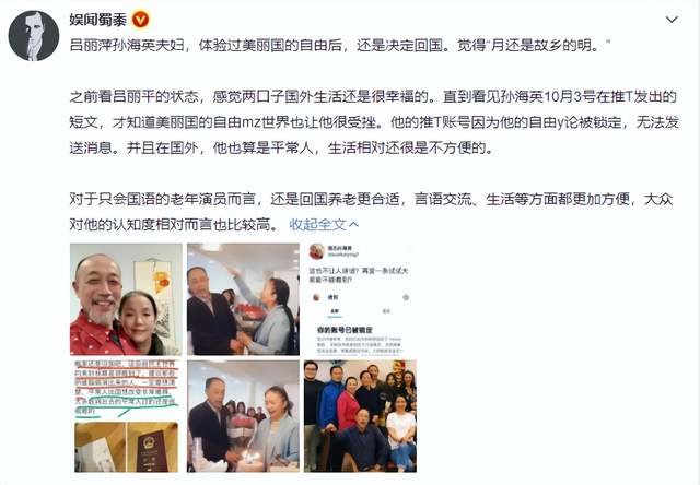 后来有不少大V分析指出,孙海英和吕丽萍一旦移民美国失败后,很有可能会回国养老,毕竟“月还是故乡的明”。