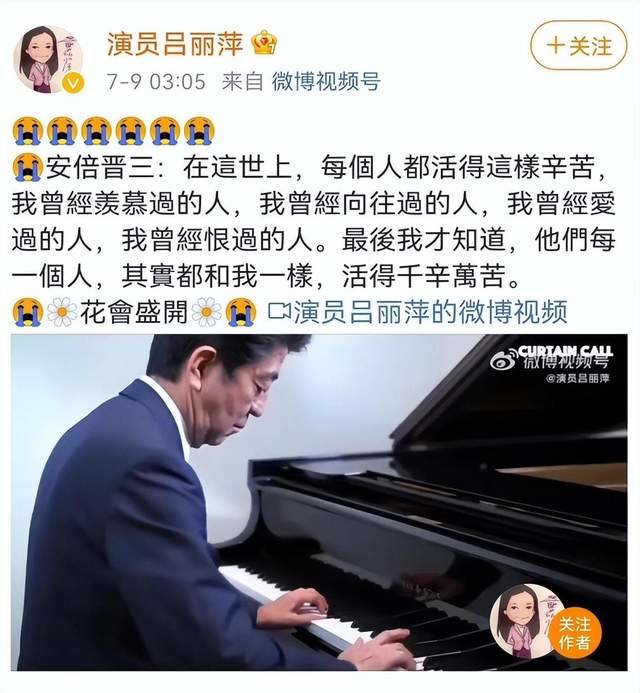 尤其是今年7月份的时候,吕丽萍通过微博公开去悼念遭到枪击身亡的日本前首相安倍晋三,哭得是梨花带雨,犹如痛失至亲一般,遭到了铺天盖地的谴责和辱骂,最后微博被禁言了,到现在都还没有解封。