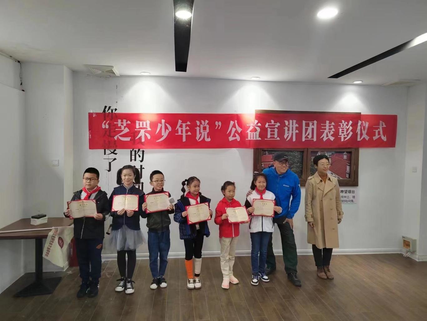 10月6日上午,由烟台市芝罘区委宣传部举办的“芝罘少年说”公益宣讲团颁奖仪式在虹口1920历史文化街区举行。烟台市芝罘历史文化研究会秘书长曲德顺老师为宣讲团2022年暑假期间参加“讲述芝罘”进社区活动的六名成员颁发了荣誉证书。