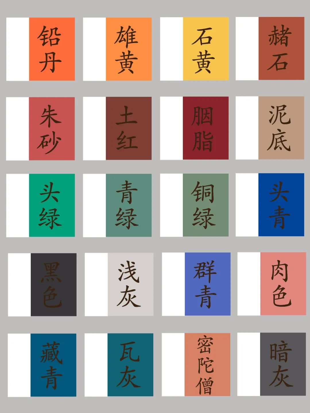 敦煌五色是最主要的五类色系,于五种色相中,还可以作进一步拆分,如红色相就包括土红、朱砂红等,绿色相可分为石绿、头绿等。因此,我们将一些色彩作了次规整,给予大家一些色彩灵感。