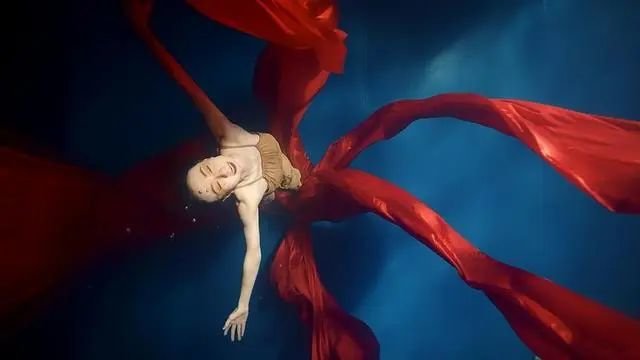 女孩一身黄衣红绸,水中起舞,翩翩舞姿,如游龙一般行云流水。