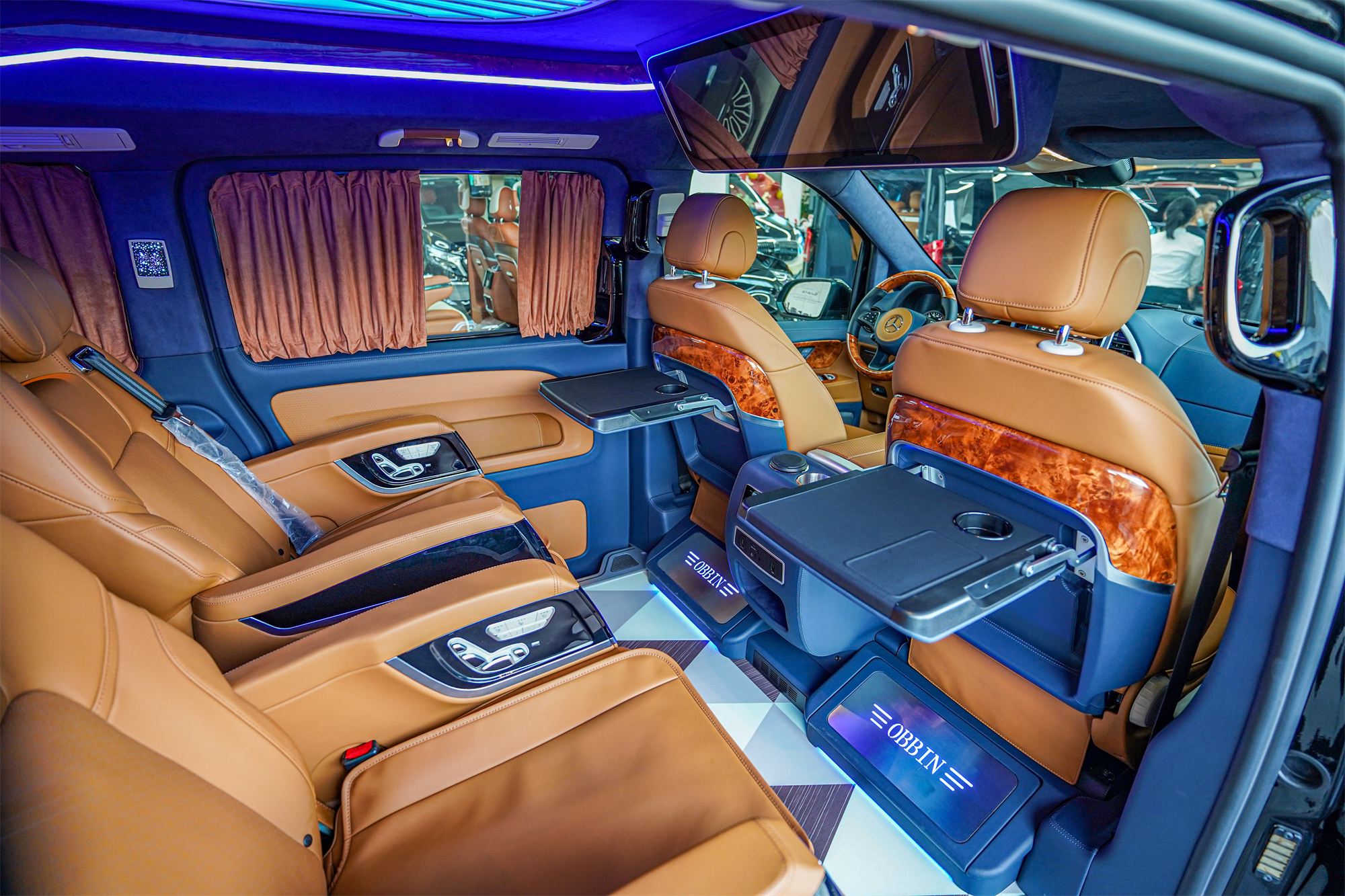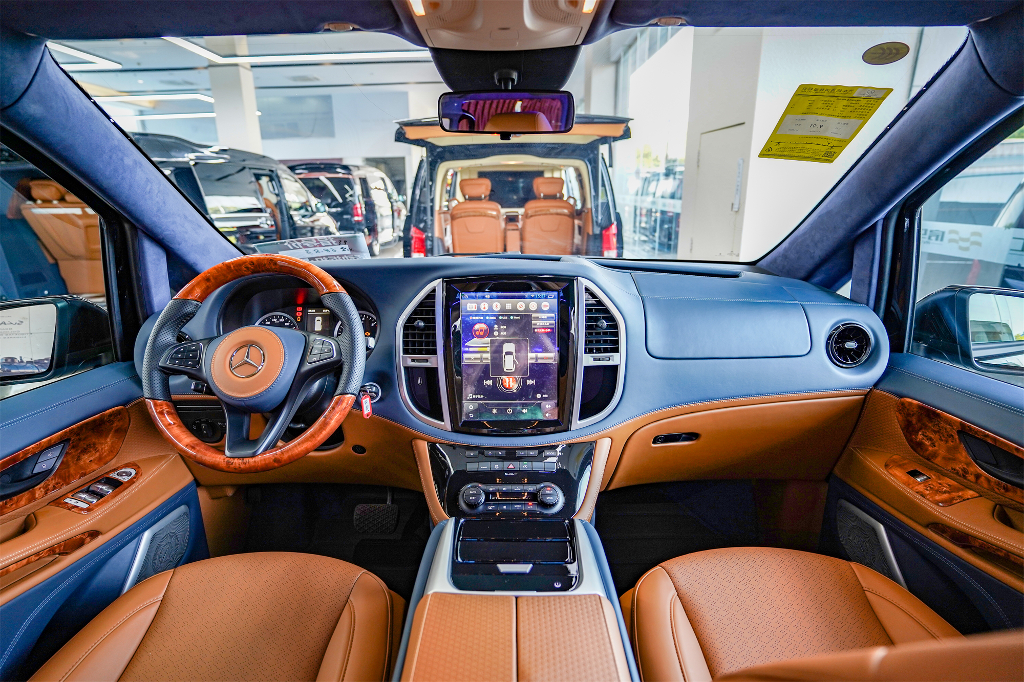 进入驾驶舱,宝蓝色与棕色搭配的色调,很有迈巴赫那韵味。升级大尺寸悬浮屏,并且带有手机无线充电功能,和超大的车载冰箱,豪华又实用。