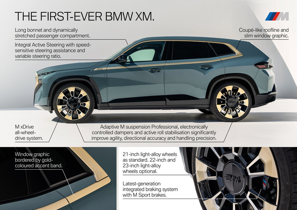 新款BMW XM是BMW M GmbH首款配备电动驱动系统的高性能车款,以及纪念首款独立车款M1的50周年而再次推出独立车型,其将尖端的驱动系统技术与壮观的车辆概念相结合。此款高性能运动型SAV(Sports Activity Vehicle)由新开发的插电式混合动力系统提供动力,可提供653 hp和800 Nm扭力的最大综效输出。除了首度采用了插电式混合动力,后轮转向系统也是BMW M首度在最高阶的M Car采用。