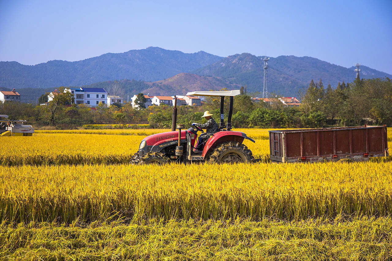 一望无际的稻田总是希望和收获的象征,田野里,勤劳的农民正在田间作业,拖拉机在收获过的土地上来回不停地开动着,在身后翻起了层层的稻浪。
