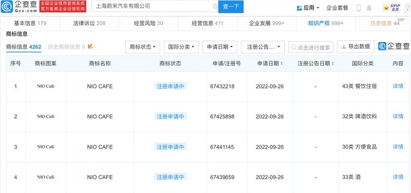站长之家10月9日 消息:企查查APP显示,近日,上海蔚来汽车有限公司申请注册4枚“NIO CAFE”商标,国际分类为餐饮住宿、啤酒饮料等,当前商标状态均为注册申请中。