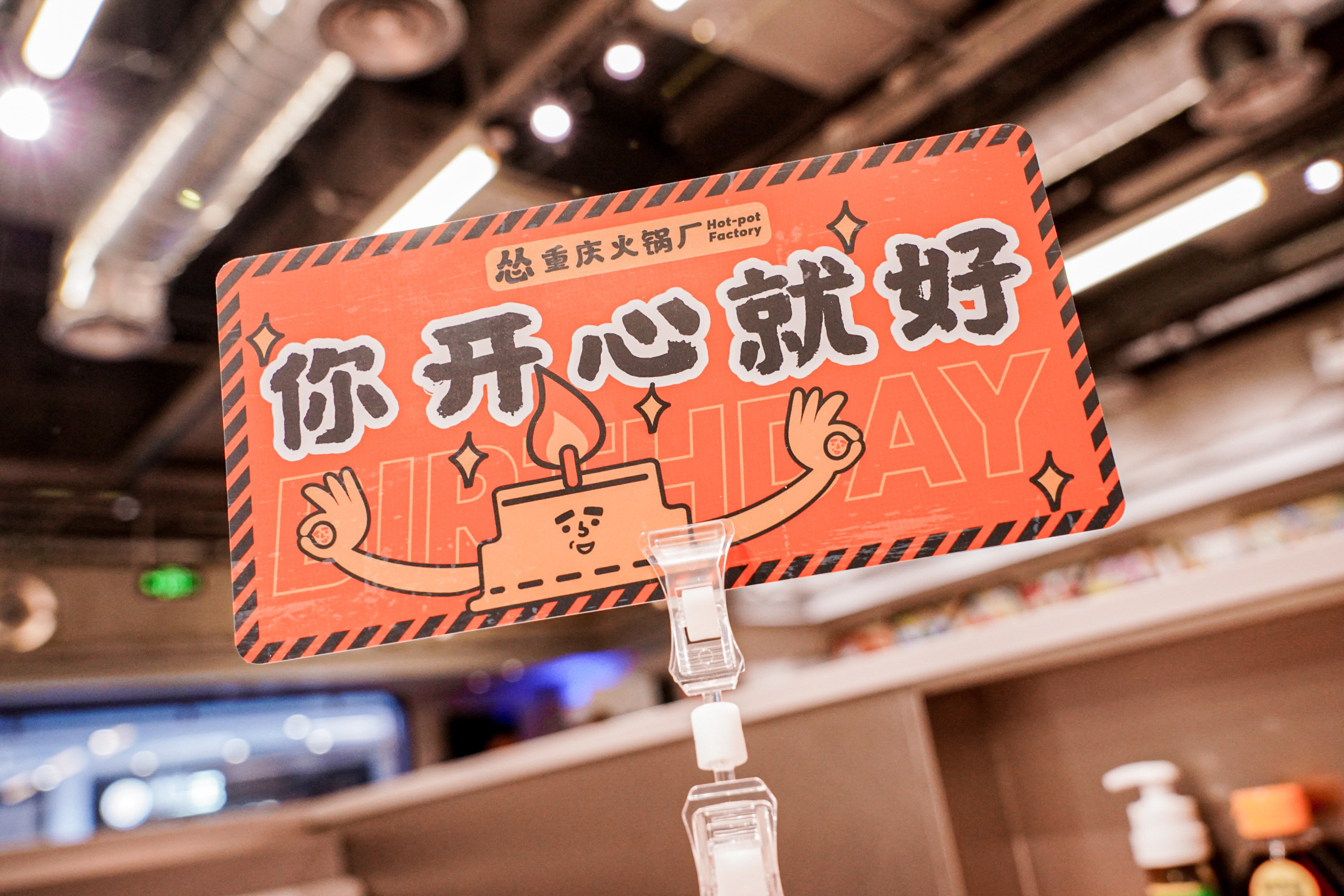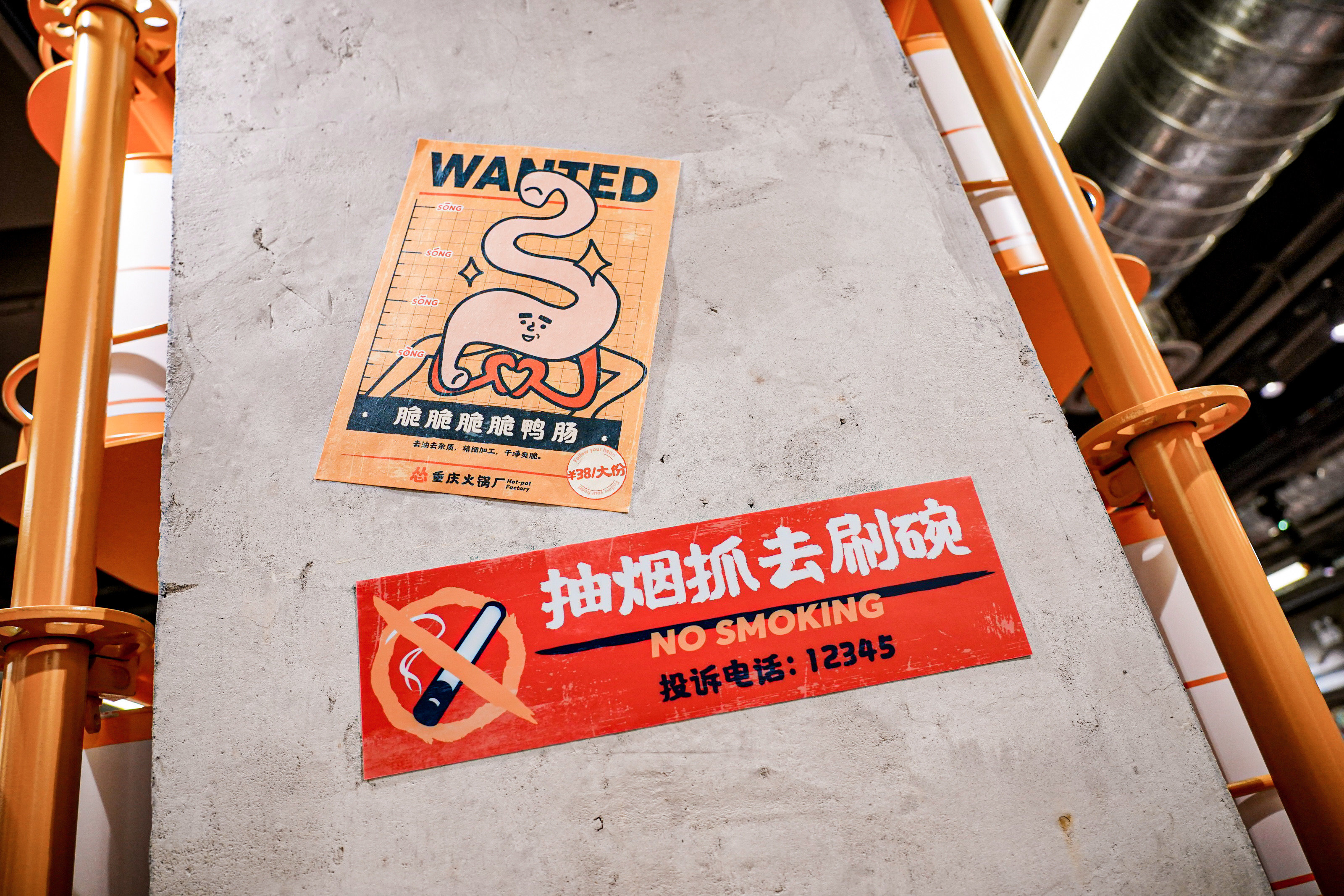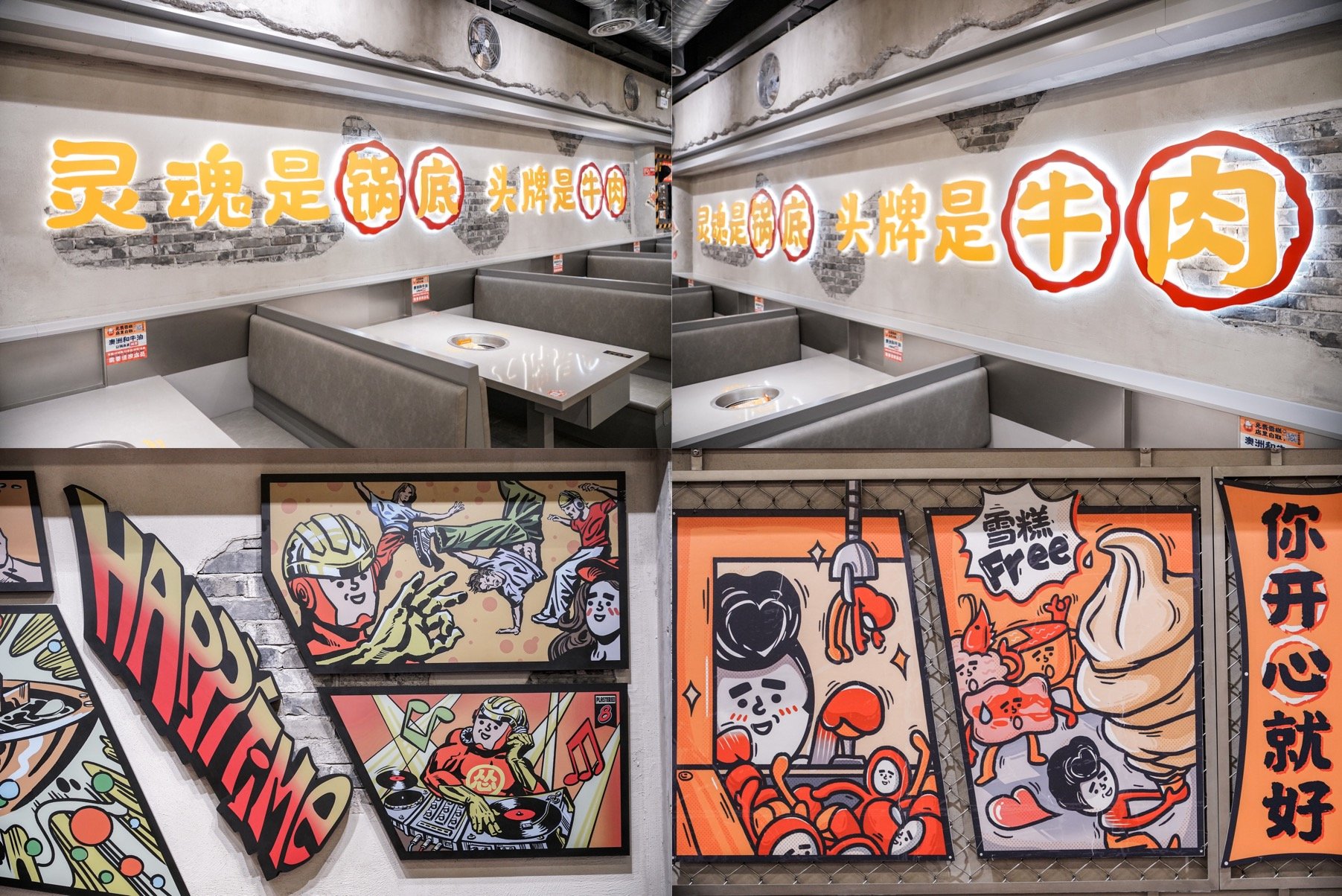作为一家深受年轻人喜欢的重庆火锅店,工业排风扇、黄银灰三色工厂风、工厂车间模样的装潢,装饰了富有趣味的图案和张贴,处处体现“快乐”元素,比如“管他几岁,开心万岁”、“你开心就好”这样的标语,“怂”得硬朗简单也标新立异,不愧是新晋的火锅“搅局者”。
