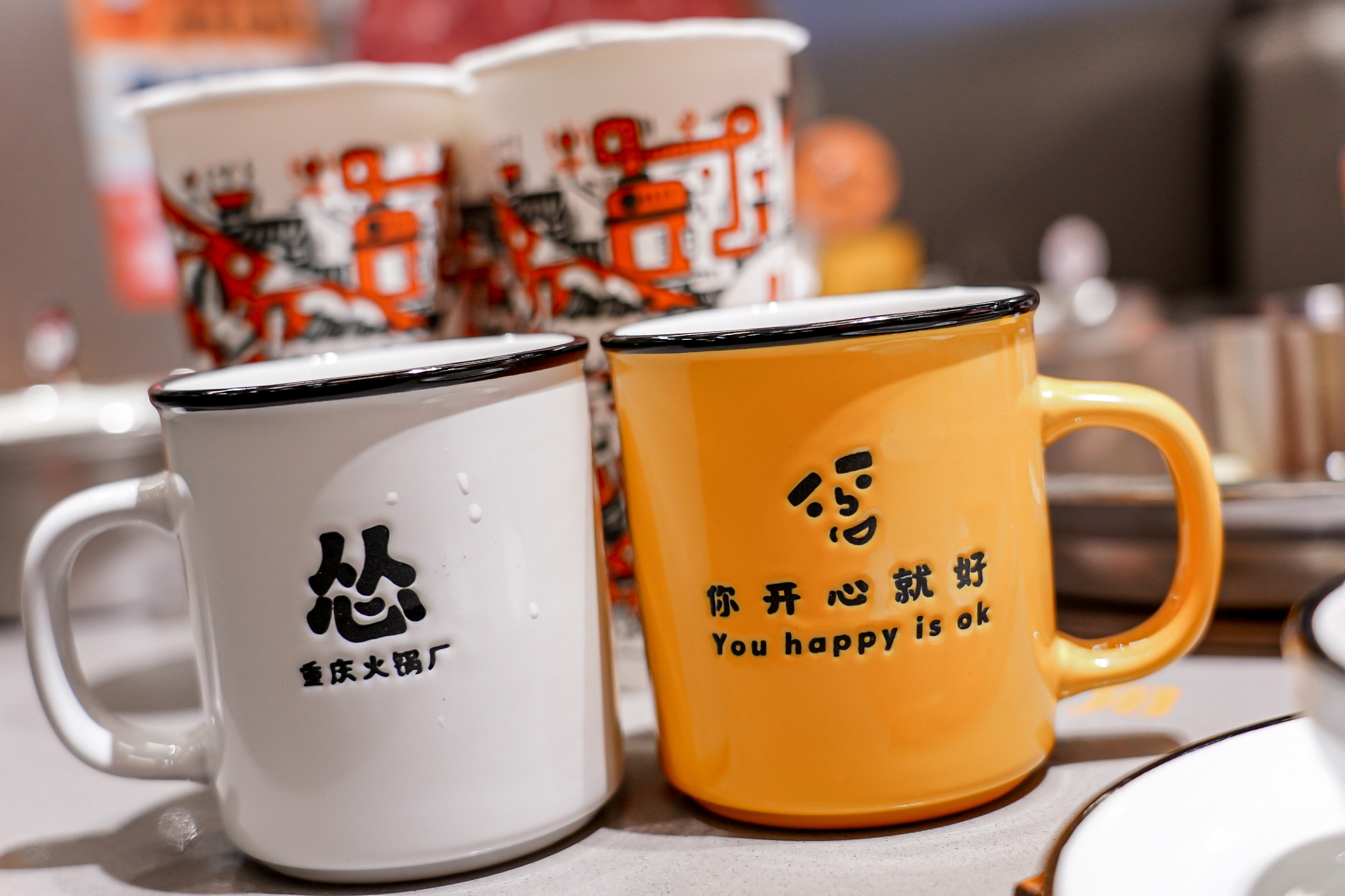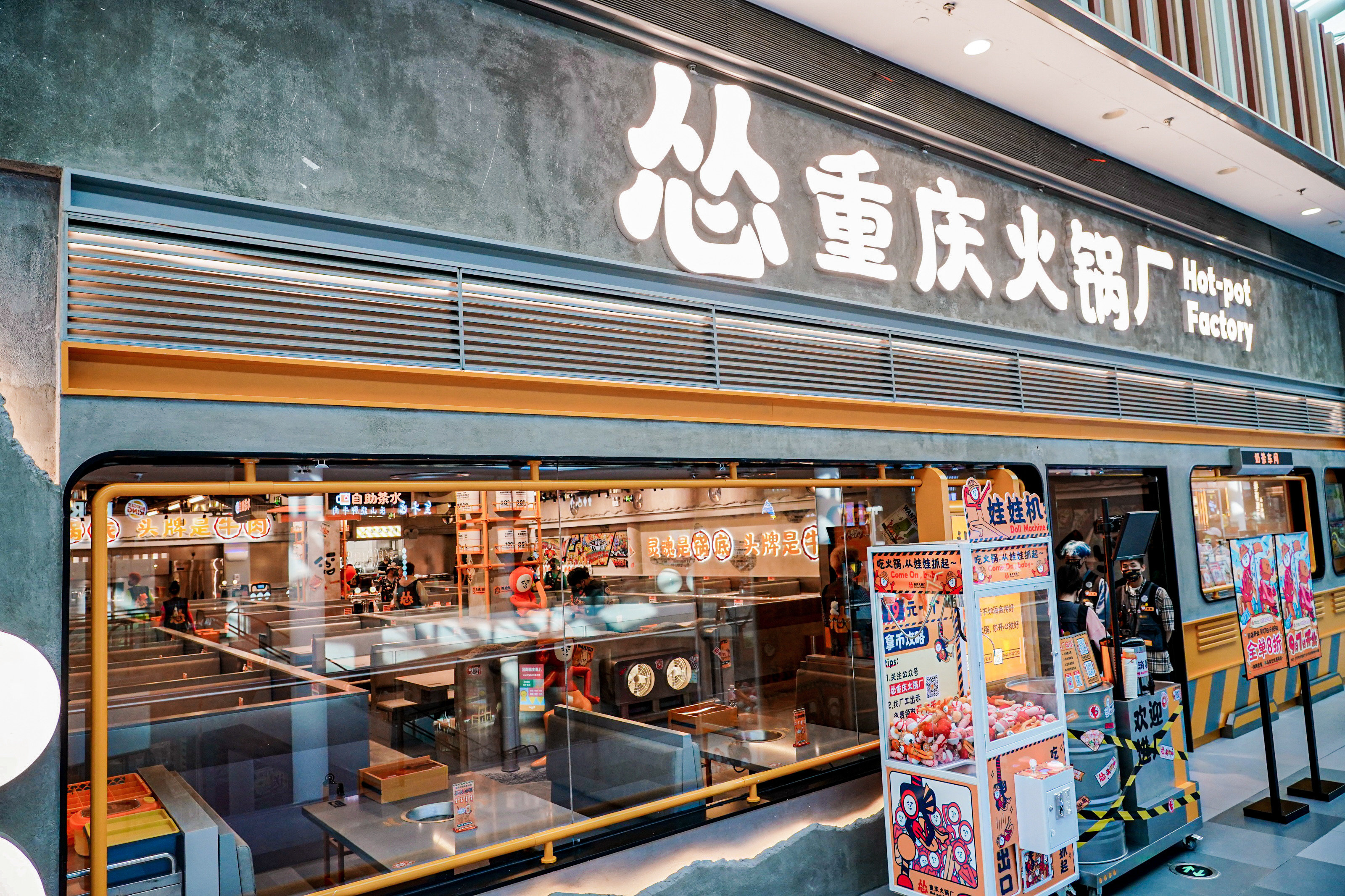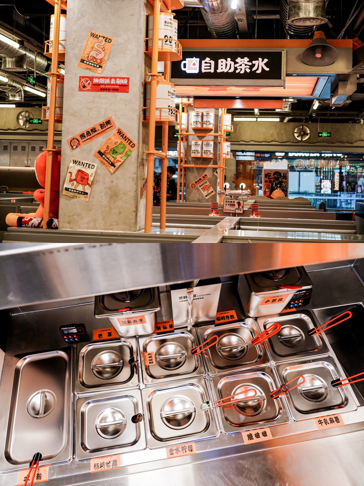 作为一家深受年轻人喜欢的重庆火锅店,工业排风扇、黄银灰三色工厂风、工厂车间模样的装潢,装饰了富有趣味的图案和张贴,处处体现“快乐”元素,比如“管他几岁,开心万岁”、“你开心就好”这样的标语,“怂”得硬朗简单也标新立异,不愧是新晋的火锅“搅局者”。