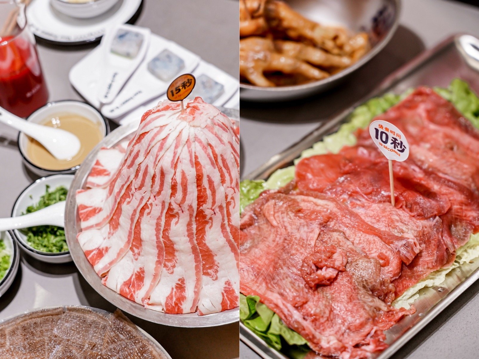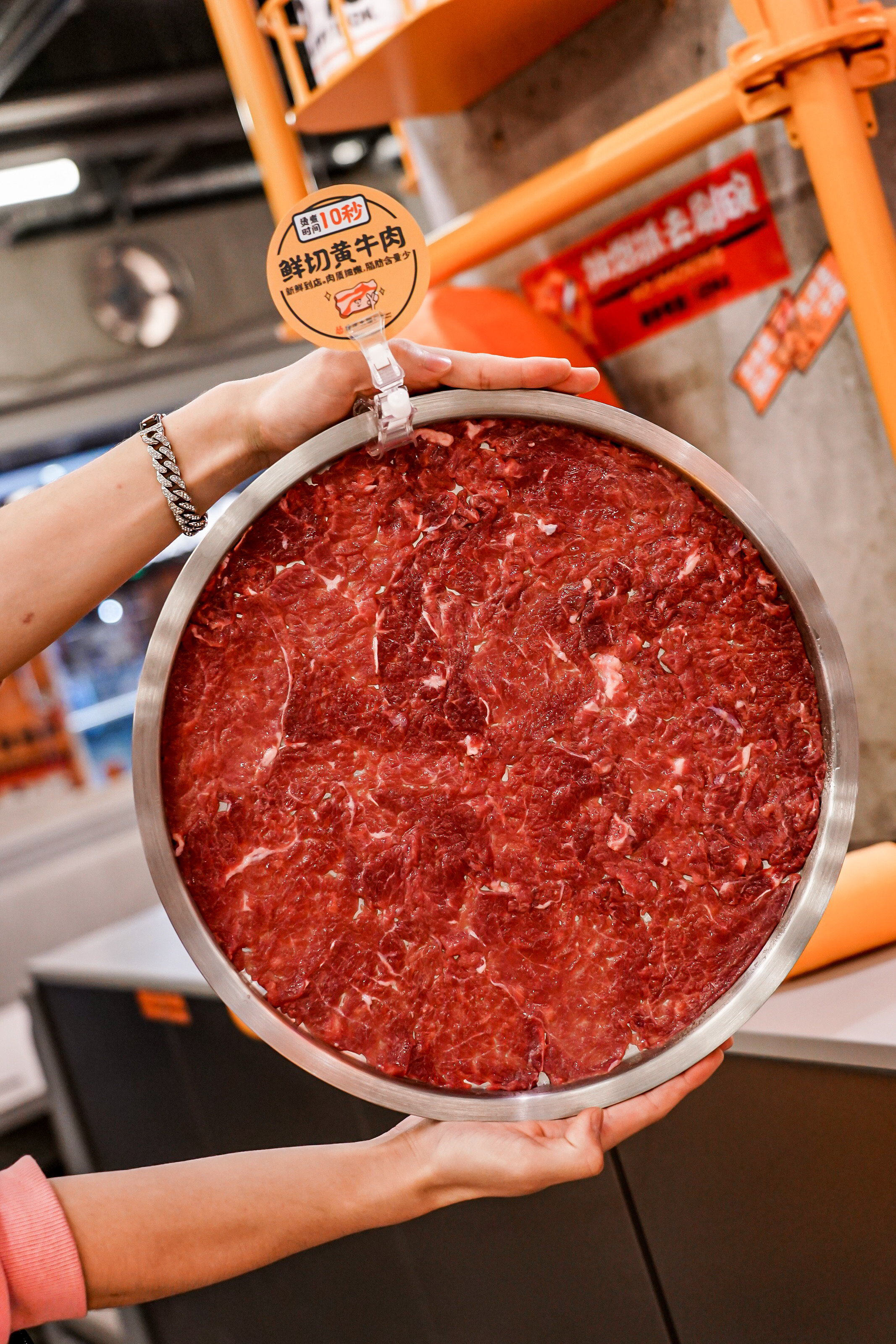 ”鲜切黄牛肉“是主推的招牌产品,每天新鲜配送、现点现切的新鲜牛肉只需烫9秒,肉质鲜嫩。强调“新鲜”,明确承诺:不新鲜就退菜,蘸简单调味料吃的是原汁原味,搭配秘制的鲜牛肉特供酱则十分过瘾。