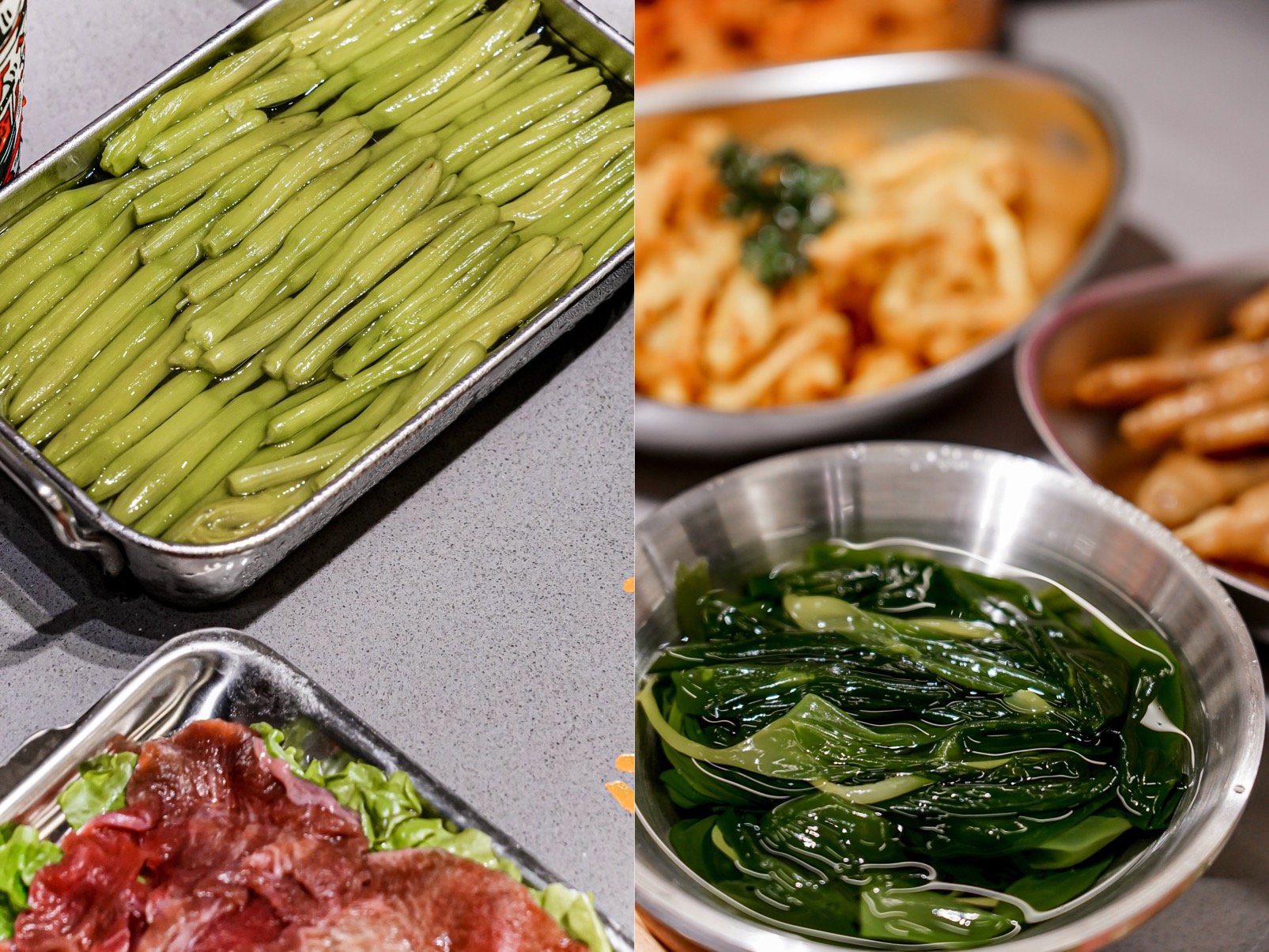 要是想吃脆口儿的涮品那肯定是毛肚和贡菜啦,咯吱咯吱的口感绝对让好牙口满足;素菜推荐试试“霞浦超鲜海带苗”和“黄花菜”,一个适合辣锅一个更配骨汤。