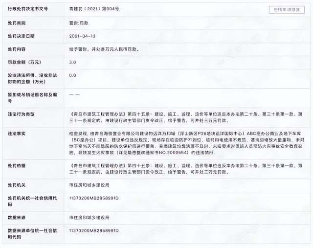 2021年4月13日,由青岛海骏置业有限公司建设的远洋万和城(浮山新区P26地块远洋国际中心)ABC座办公商业及地下车库(BC座办公)项目,建设单位违反规定,现场存在临边防护不到位、临时用电使用不规范、基坑边堆放大量重物、未对地下室当天不能隐蔽的防水保护层进行覆盖、易燃建筑垃圾清理不及时、未按要求对值班人员预防火灾事故安全教育交底,导致发生火灾事故(详见隐患整改通知书NO.2000554)的违法情形。
