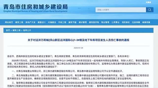 紧接着,工地上发生了事故。2020年7月25日,远洋万和城(浮山新区远洋国际中心)1-3#楼及地下车库项目发生一起电梯井内高处坠落事故,导致1人死亡。
