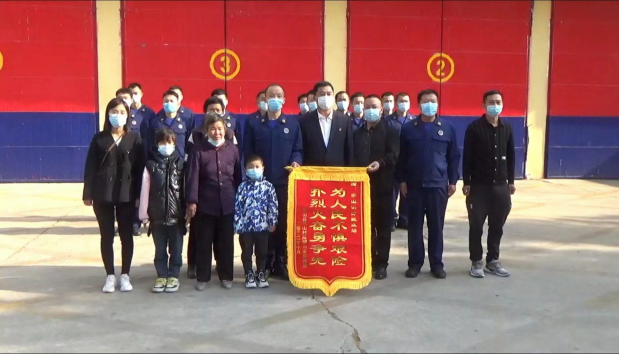 10月8日,被济宁消防紧急施救化险为夷的五岁儿童在家属的陪伴下来到济宁市消防救援支队梁山消防救援站,将一面题有“为人民不惧艰险,扑烈火奋勇争先”的鲜红锦旗送至消防员手中,向危急时刻英勇无畏的消防员表示真诚的谢意和崇高的敬意。