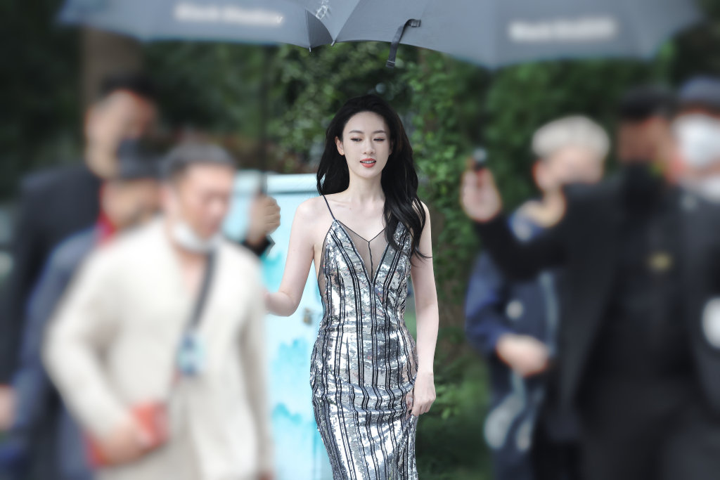 2022年10月8日,上海,童瑶身穿银色吊带长裙抵达VOGUE活动会场。