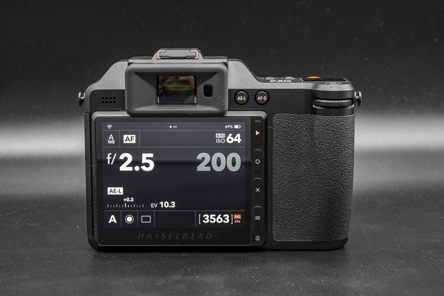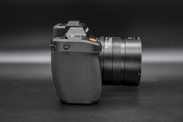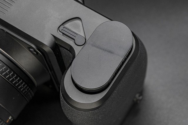 哈苏X2D 100C新增加了1.08英寸彩色肩屏设计,便于显示当前相机的参数状态。快门按钮为橙色,并具备“H”这个哈苏的标志性设计的字幕,非常醒目。