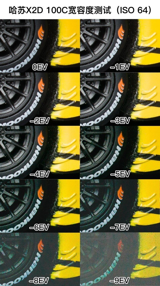 在ISO 64时,哈苏X2D 100C的宽容度表现很好。即使来到-4EV,我们将亮度修复之后,画面也没有明显的噪点增加或者偏色。直到-5EV,画面开始有轻微偏色,但是噪点并没有明显增加。从-6EV开始,噪点开始增加,并且画面开始偏色严重。