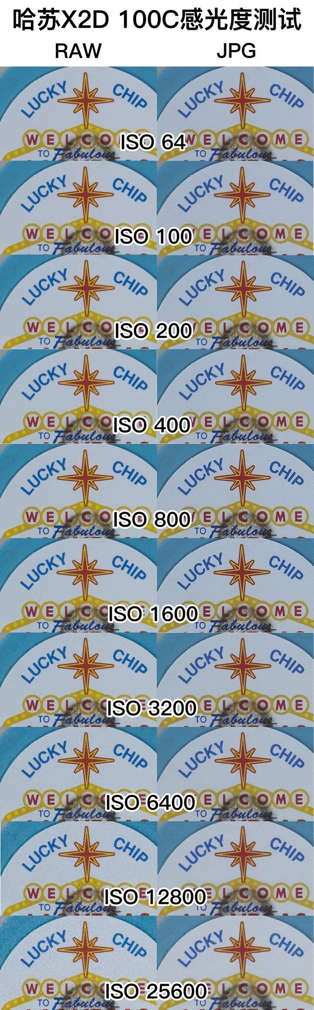 接着就是高感画质表现,哈苏X2D 100C的高感画质非常优秀。我们的测试结果是原始图片经过100%放大之后,直接去了非常微小的区域呈现的。从我们的测试结果中可以看到,从原生感光度ISO 64开始,一直到ISO 6400,哈苏X2D 100C都拥有非常出色的控噪表现,照片完全可用。ISO 12800到ISO 25600,噪点有明显增加,但是画面依然可用。