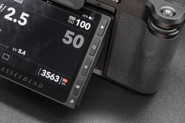 哈苏X2D 100C的屏幕支持翻折操作,可以实现40°和70°的翻折角度。按键设计在屏幕侧面,菜单界面的逻辑很好,上手比较快速。屏幕支持触摸操作,非常好用,对于现在的年轻用户来说,可以通过触摸方式来使用。尤其是哈苏X2D 100C的对焦区域可以通过触摸或者在屏幕上滑动来更改位置,这个体验性很好。