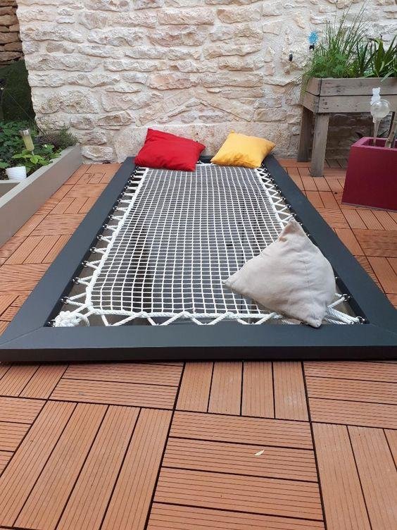 想要将小院做休闲庭院,户外桌椅是标配,是必不可少的。可国外家庭真好玩,不做户外桌椅,将公园里倾斜30度的造型网床搬回自家院子,当户外家具使用,这样也行吗?不知道大家有没有见过?