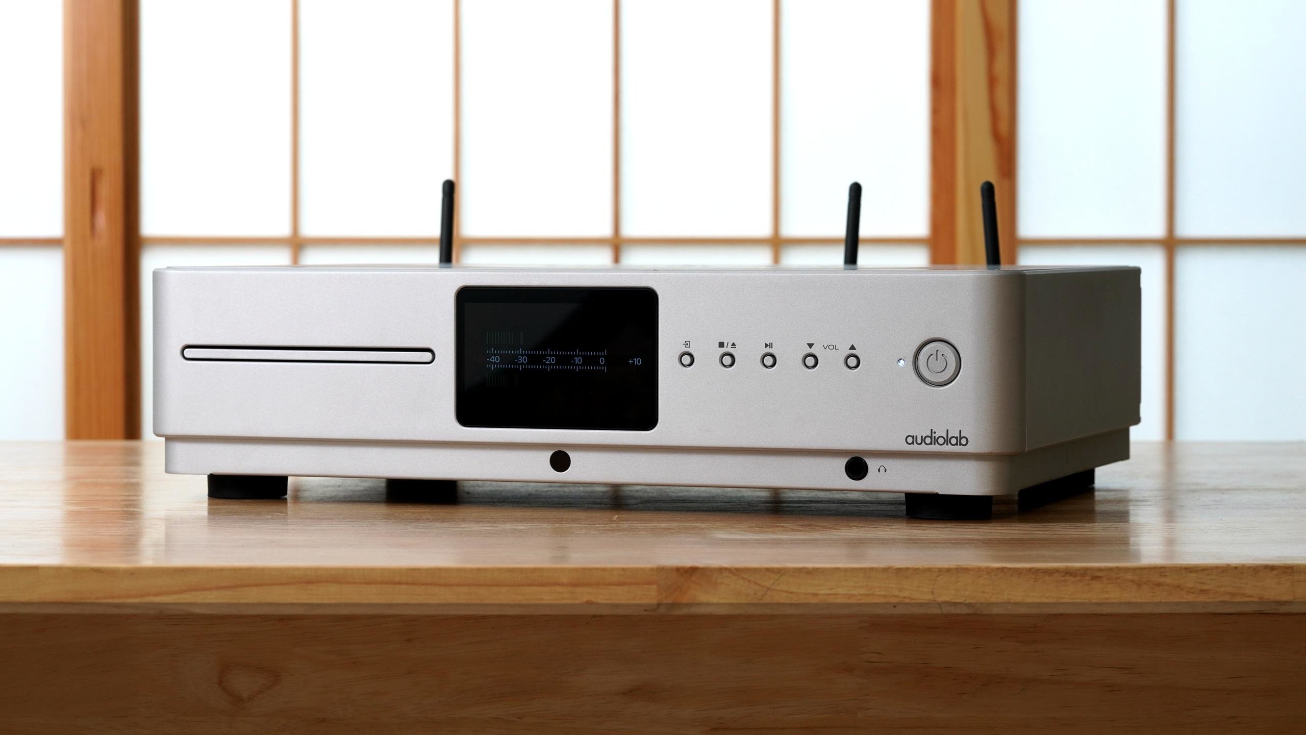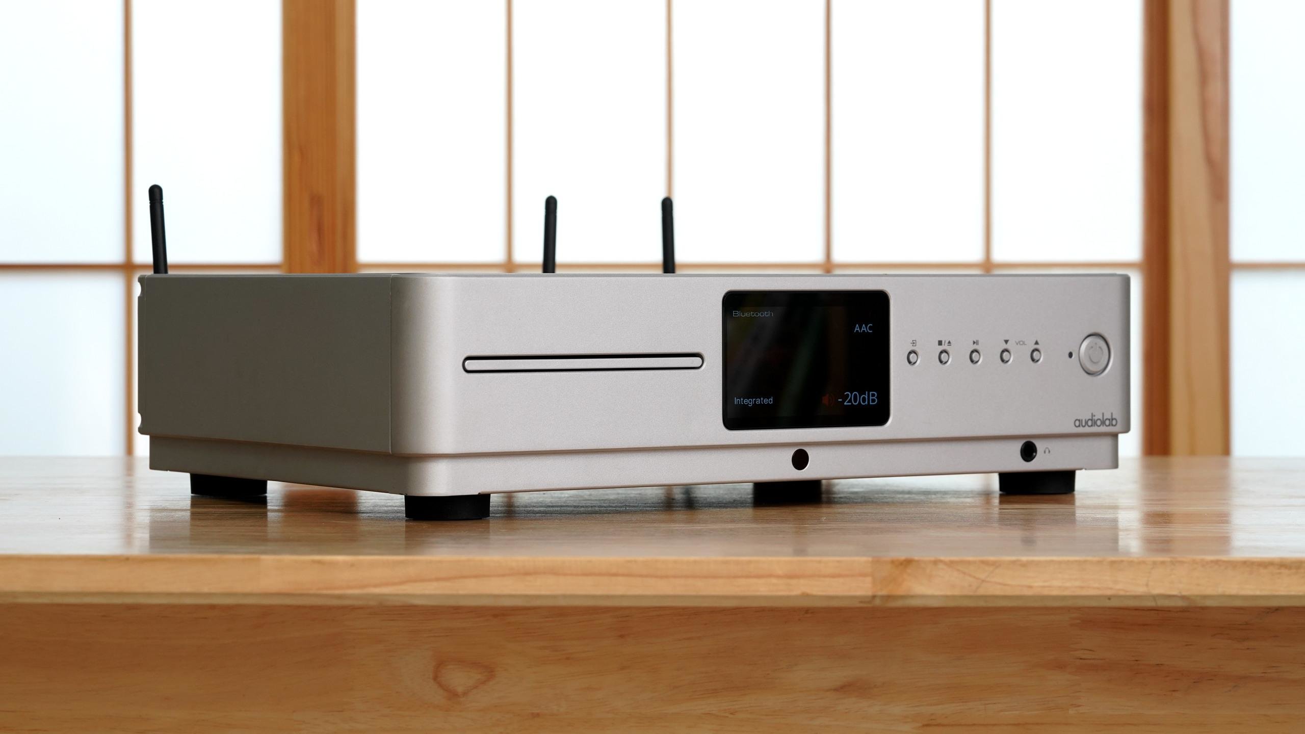 Audiolab傲立Omnia尺寸为440 x156 x 327MM,重量为9.1KG,延续了以往产品的简约外观,但显得更加圆润,左边为CD仓,中间是一块4.3英寸的IPS显示屏,遗憾的是没有触控功能,右边是功能按键以及电源键,下方为6.3MM耳机接口。