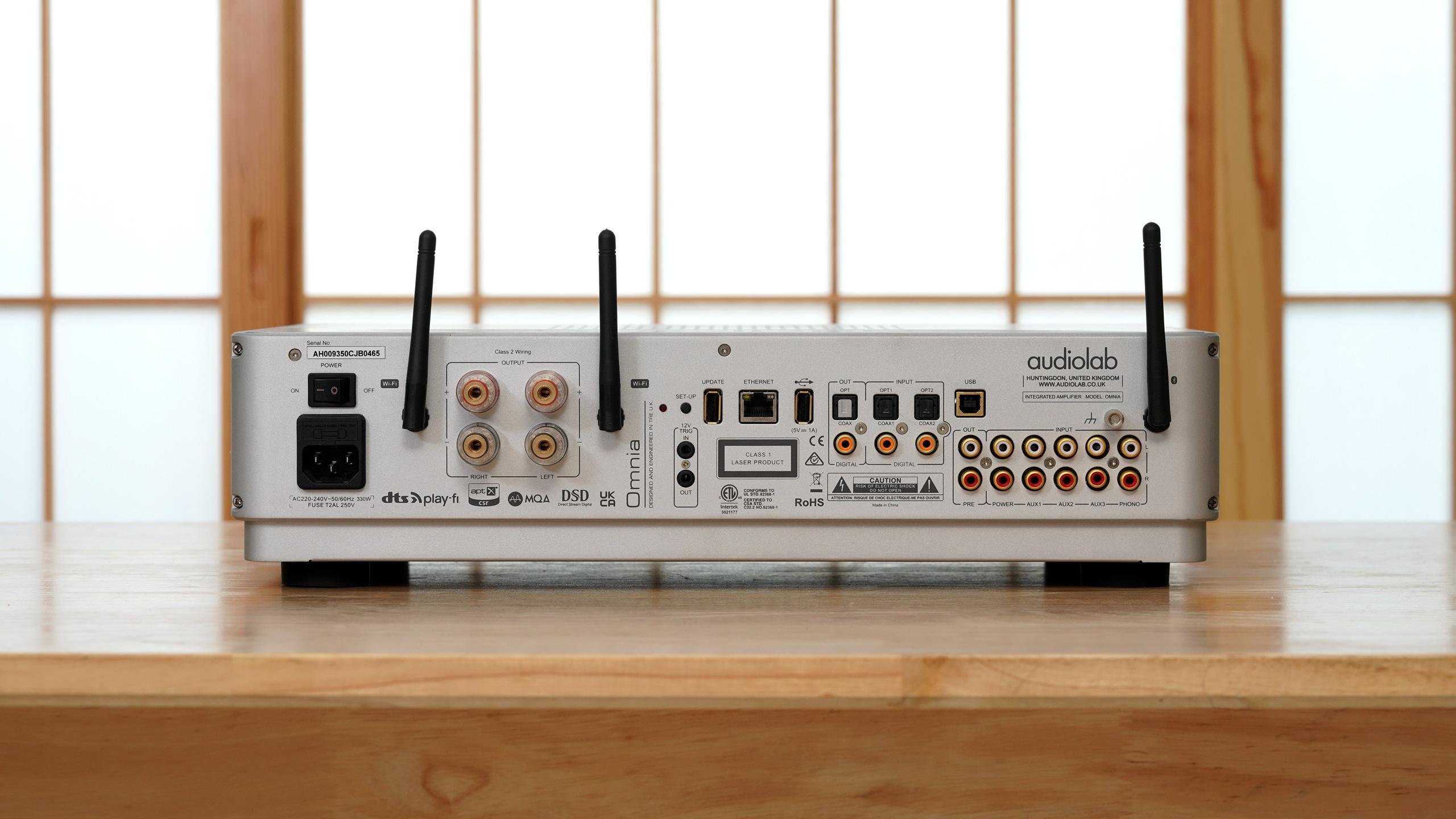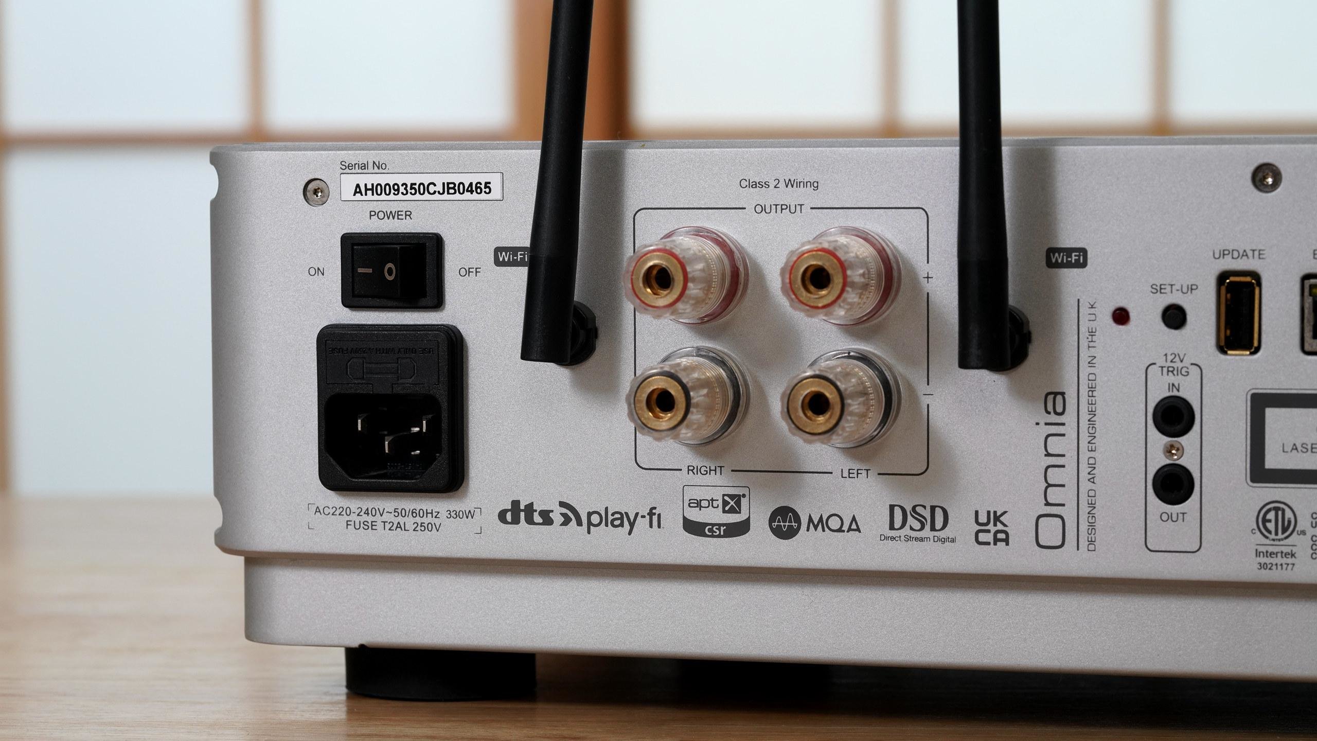 在接口方面Omnia可以说是Hifi一体机之最了,模拟输入:RCA x 3、Phono(MM) x 1、RCA后级输入 x 1。数字输入:同轴 x 2、光纤 x 2、USB type B x 1、USB type A x 1、DTS Play-Fi串流、蓝牙(aptX/aptX LL)、局域网。模拟输出:RCA前级输出 x 1、6.3mm耳机输出 x 1。也许是因为看到了黑胶的复兴,因此Omnia特意加入了MM接口,我认为也是Omnia的一大卖点。当然我们不能对这个MM唱放功能要求太高,毕竟如果用到这个来做唱放的用户,大部分也是使用入门级的LP,到了一定程度之后他们自然会考虑更高端的独立唱放。