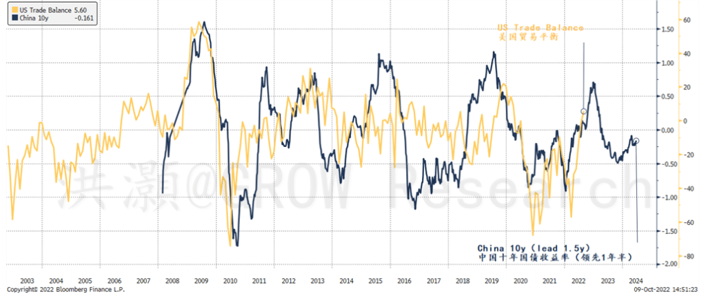 中国十年期国债收益率早就预示了这两个重要贸易对手的对外账户即将发生的变化。中国十年期国债收益率往往领先美国需求长达18个月。过去一年中国十年期国债收益率扶摇直下,确乎预示着未来几个月美国进口的减退和美国贸易逆差的改善。
