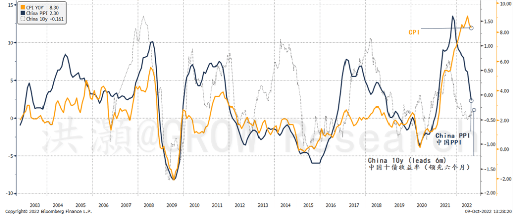 图表3: 中国PPI/债券收益率双双下降表明美国CPI见顶;中国十年期国债收益率领先美国通胀。