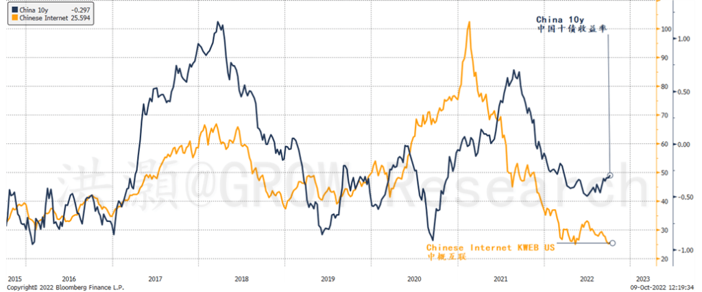 图表4: 中概股与中国十年期债券收益率走势背离。