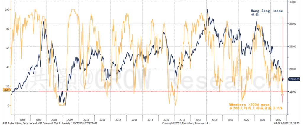 诚然,地缘政治的阴霾笼罩着香港,香港面临着一些艰巨的地缘政治挑战,比如美国加大了对中国半导体技术的出口禁令,中国的美国存托凭证(ADRs)审计是另一个悬而未决的问题。更遑论香港金管局在与美联储同步提高最优惠利率方面拖泥带水,并选择消耗外汇储备来捍卫与美元挂钩的联系汇率制。但在如此这般的超卖水平上,诸多不利消息肯定已经为价格所反映。