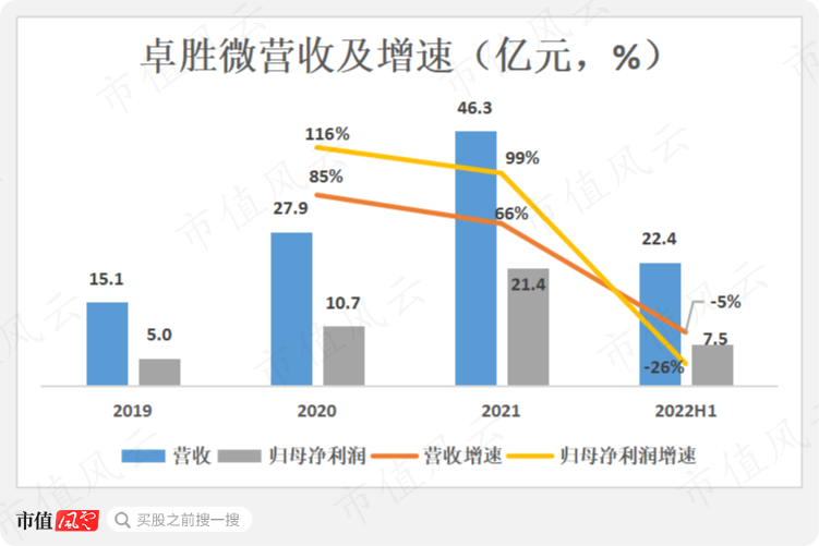 卓胜微上市于2019年6月,属集成电路行业的射频前端领域,核心产品主要应用于智能手机等移动智能终端,上市以来营收规模及归母净利润保持高速增长,但2021年来增速上有所放缓。