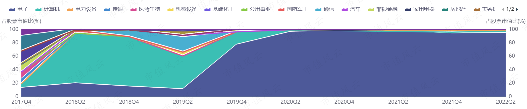 首先从行业来看,2018年以来该基金的投资主要在计算机、电子以及传媒等方向。蔡嵩松管理后,投资方向向电子板块倾斜,2020年以来,电子行业保持在第一大重仓板块,且占股票市值的比例稳定在90%以上。