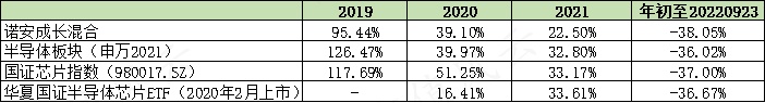 据Choice数据统计,半导体板块在2020、2021以及2022年(截至9月23日)涨跌幅分别为40%、33%、-36%,诺安成长相对应的三个阶段涨跌幅分别为39%、23、-38%,竟全面跑输板块涨幅。