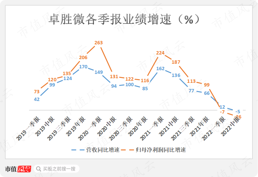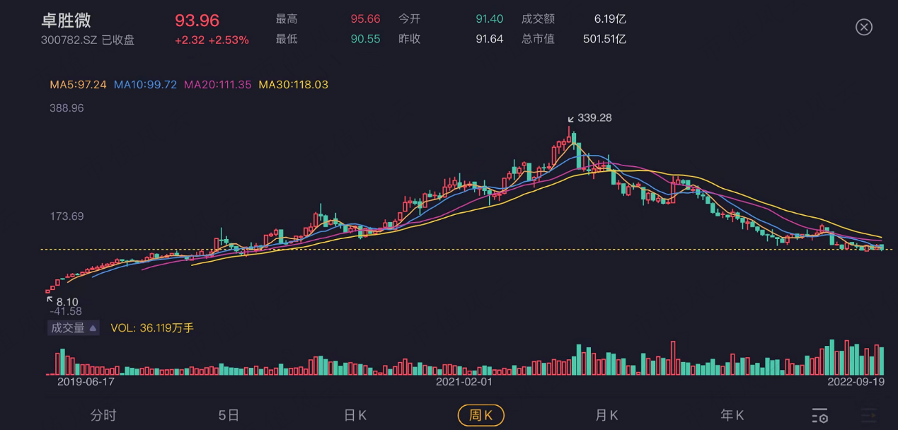 公司上市后股价一路上扬,随着业绩增速的放缓,股价上升到2021年6月339元/股(前复权)的高点后掉头向下,截至2022年9月23日,卓胜微股价为94元/股,仅一年多的时间较最高点跌超70%。