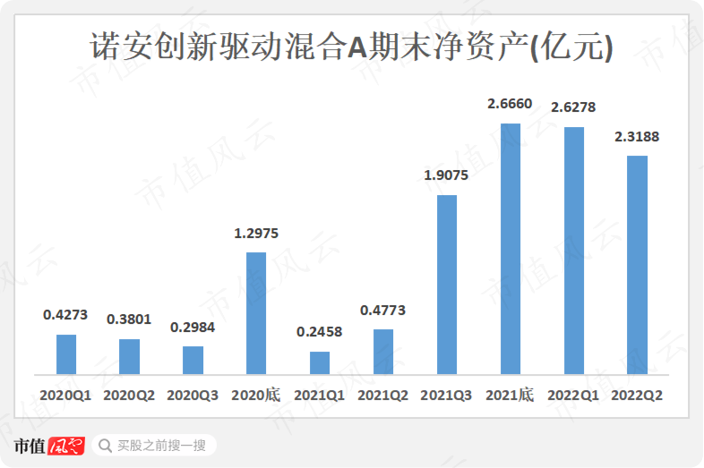 诺安创新驱动混合A在2021年一季度末的期末净资产仅2458万,也就是俗称的迷你基金(净资产低于5000万,有清盘风险),蔡嵩松接手后,基金净资产蹭蹭上涨,仅两个季度基金规模就升至近2亿。