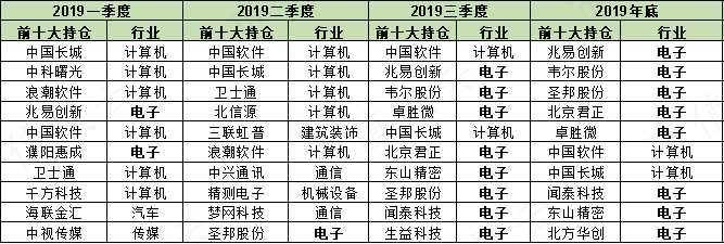 从具体个股来看,2019年上半年,计算机板块仍是投资主力,但下半年则开始以电子板块为主,尤其是电子板块中的半导体,截至2019年底,十大重仓股中有8只半导体相关个股。
